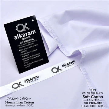 Al-karam Liza Cotton-Unstitched Men's Wear offers superior quality fabric, designed to be lightweight and breathable. Made from 100% cotton, this fabric is ideal for hot summer days and features an airy weave to help keep you cool. The high thread count ensures a durable, long-lasting material to give you the best value for your money.